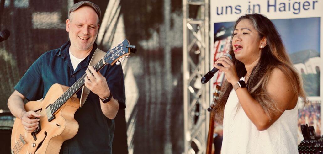 Das Duo passt hervorragend in das Konzept des städtischen Fachdienstes Öffentlichkeitsarbeit, der hochwertige Musik im Unplugged-Stil für die Sonntagnachmittage vorgesehen hat. Die aus Manila stammende Sängerin verfügt über eine ungemein warme, tiefe Stimme und wartet mit einem großen Spektrum an Umfang und Expressivität auf. Ihr Partner überzeugt als Begleitmusiker und -Sänger und zeigt ungemeine Spielfreude, wenn man ihn als Fingerstyle-Gitarrist von der Leine lässt. Da begeistert Michael Diehl mit seinem „Groovin‘ for Breakfast“ und beweist, dass eine Gitarre durchaus auch ein Perkussion-Instrument sein kann. Klasse!